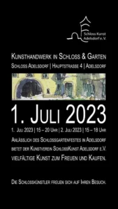Am 01. und 02. Juli 2023 fand anlässlich des Schlossgartenfestes im Schloss & Garten in Adelsdorf ein Handwerkermarkt des Schlosskunst Adelsdorf e.V. statt. Verschiedene Mitglieder des Vereins boten Produkte ihres künstlerischen Schaffens zum Besichtigen und Verkauf an. Die Künstler waren mit Erläuterungen und Hinweisen für interessierte Besucher stets ansprechbar.